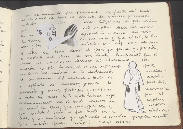 Desde entonces siento que toda la Tierra es mi casa, y que el Sol, la Luna y las estrellas son mis pertenencias. Me liberé de todo deseo de alcanzar posición, fama y riquezas, así como de ser fuerte. Comprendí que el Budo no consiste en derribar al adversario por la fuerza ni es un instrumento para conducir al mundo a la destrucción mediante las armas. El verdadero Budo es aceptar el espíritu del Universo, preservar la paz del mundo y criar, proteger y cultivar correctamente a todos los seres de la Naturaleza. Entendí que el entrenamiento en el Budo consiste en captar el amor de Dios, que cría, protege y cultiva con rectitud todo lo que existe en la Naturaleza, para asimilarlo y emplearlo en nuestra propia mente y en nuestro propio cuerpo.”